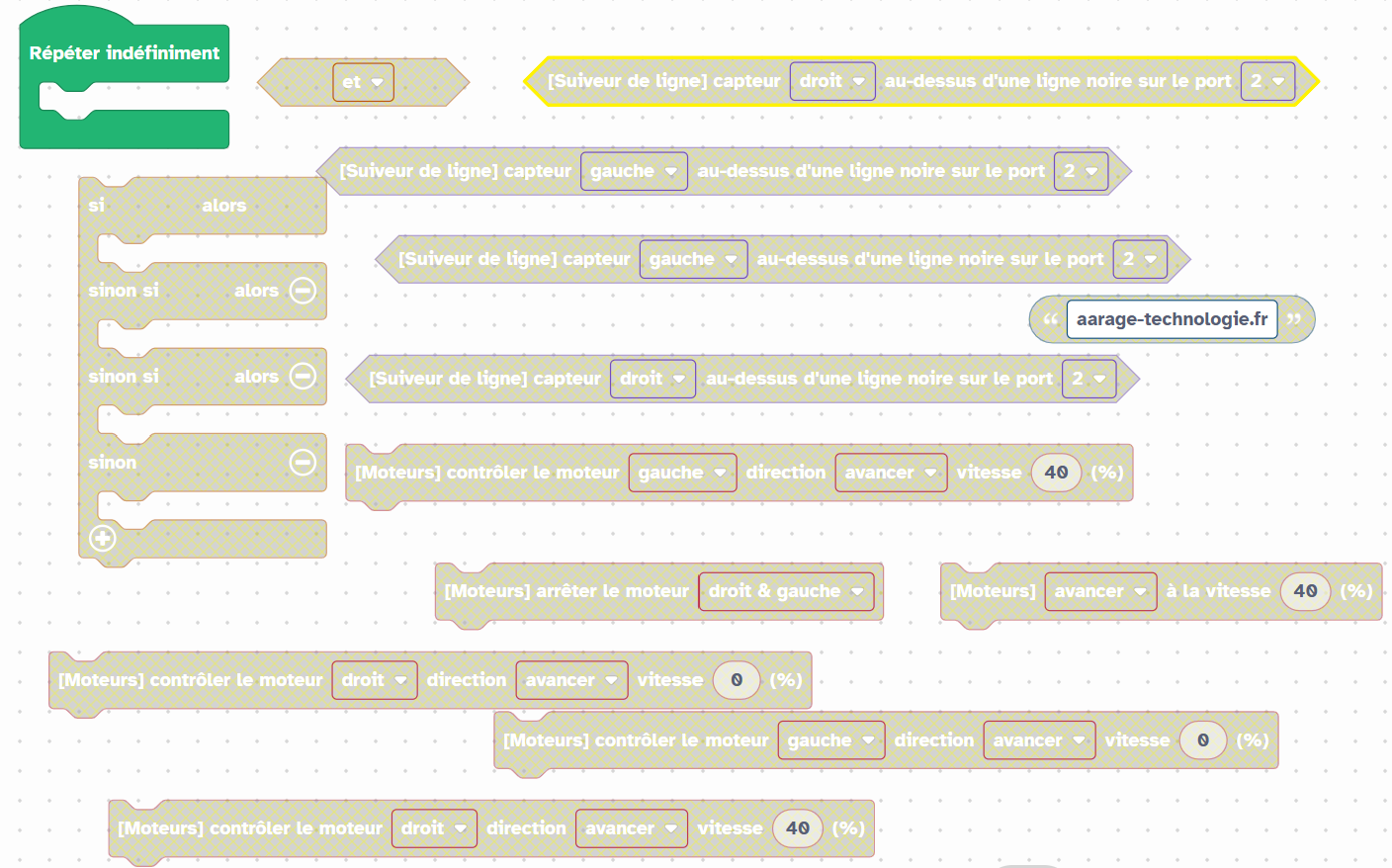 Ici, il faudra tester la valeur du détecteur de ligne (0, 1, 2 ou 3) à l'intérieur d'une boucle infinie.