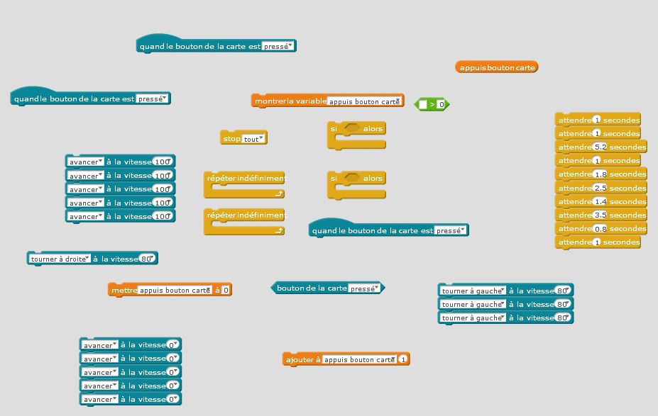 Le programme démarre lorsque le bouton de la carte est enfoncé Le robot avance tout droit pendant un certain temps (à définir de façon expérimentale) Le robot s'arrête et tourne à gauche durant un certain temps pour obtenir une rotation de 90°(à définir de façon expérimentale) Le robot avance tout droit pendant un certain temps (à définir de façon expérimentale) Le robot s'arrête et tourne à gauche durant un certain temps pour obtenir une rotation de 90°(à définir de façon expérimentale) Le robot avance tout droit pendant un certain temps (à définir de façon expérimentale) Le robot s'arrête et tourne à droite durant un certain temps pour obtenir une rotation de 90°(à définir de façon expérimentale) Le robot avance tout droit pendant un certain temps (à définir de façon expérimentale) Le robot s'arrête et tourne à gauche durant un certain temps pour obtenir une rotation de 90°(à définir de façon expérimentale) Le robot avance tout droit pendant un certain temps (à définir de façon expérimentale) Le robot s'arrête ---------------------------------------------------------------------------------------------------------------------------------------- L'objectif des deux algorithmes suivants est de créer un programme permettant de démarrer le programme en appuyant sur le bouton de la carte. En cas de problème, on doit pouvoir arrêter le programme à tout moment en appuyant un seconde fois sur ce même bouton. On doit pouvoir redémarrer le programme au début en appuyant à nouveau sur ce même bouton. Il va donc falloir créer une VARIABLE dans Mblock, capable de compter le nombre d'appuis sur la carte. Description du 2ème ALGORITHME DE LA MISSION 2 Lorsque le bouton de la carte est pressé, on doit mettre une fois la variable "Appuis bouton carte" à zéro. Après avoir attendu 1 seconde, et pendant toute la durée du programme: si le bouton est enfoncé : ajouter "1" à la variable "Appuis bouton carte" Description du 3ème ALGORITHME DE LA MISSION 2 Lorsque le bouton de la carte est pressé, et pendant toute la durée du programme on doit voir apparaître la variable sur la scène de Mblock Si la variable "Appuis bouton carte" à une valeur supérieure à zéro, stopper tout le programme. ----------------------------------------------------------------------------------------------------------------------------------------------------- |