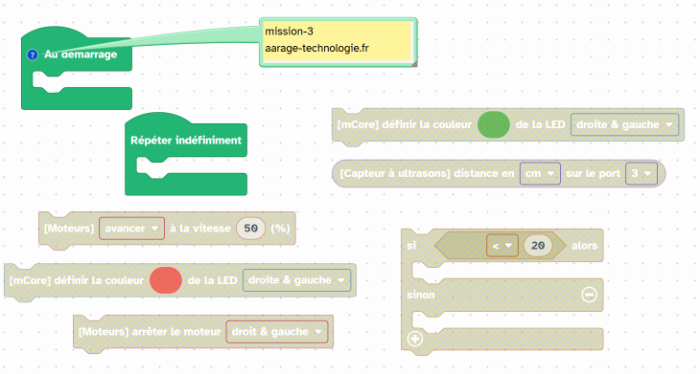 Utiliser le capteur à ultrasons pour détecter un obstacle. Le robot doit s'arrêter automatiquement à moins de 20 cm d'un mur.