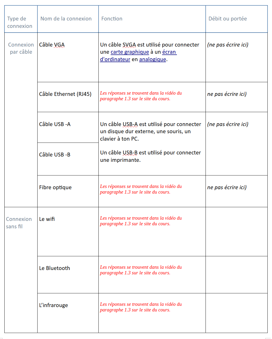 répertorier dans le tableau de votre document réponse les différents moyens de connexion d'un