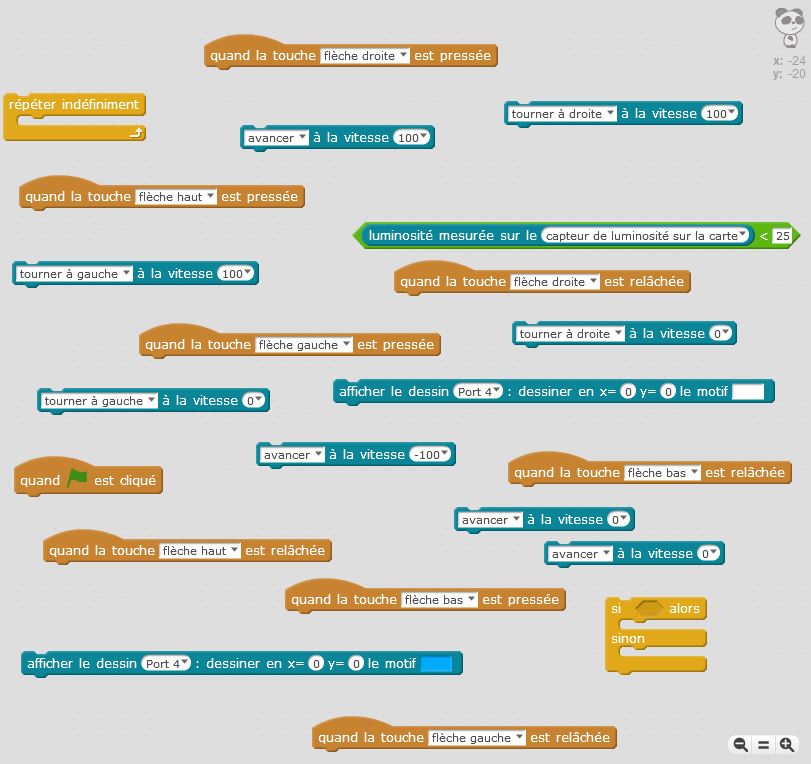 Description de l'ALGORITHME DE LA MISSION 1 Le robot avance tout droit si la flèche du haut est enfoncée Le robot s'arrête si la flèche du haut est relâchée Le robot recule tout droit si la flèche du bas est enfoncée Le robot s'arrête si la flèche du bas est relâchée Le robot tourne à droite si la flèche droite est enfoncée Le robot ne tourne plus si la flèche de droite est relâchée Le robot tourne à gauche si la flèche gauche est enfoncée Le robot ne tourne plus si la flèche gauche est relâchée Réaliser l'action suivante de façon continue: Si le capteur de luminosité de la carte détecte une lumière inférieure à celle du reste du labyrinthe, alors allumer tout le panneau de led. |